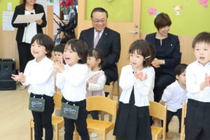 在園児のお友達より、歌やメダルのプレゼントを受けた入園のお友達。
